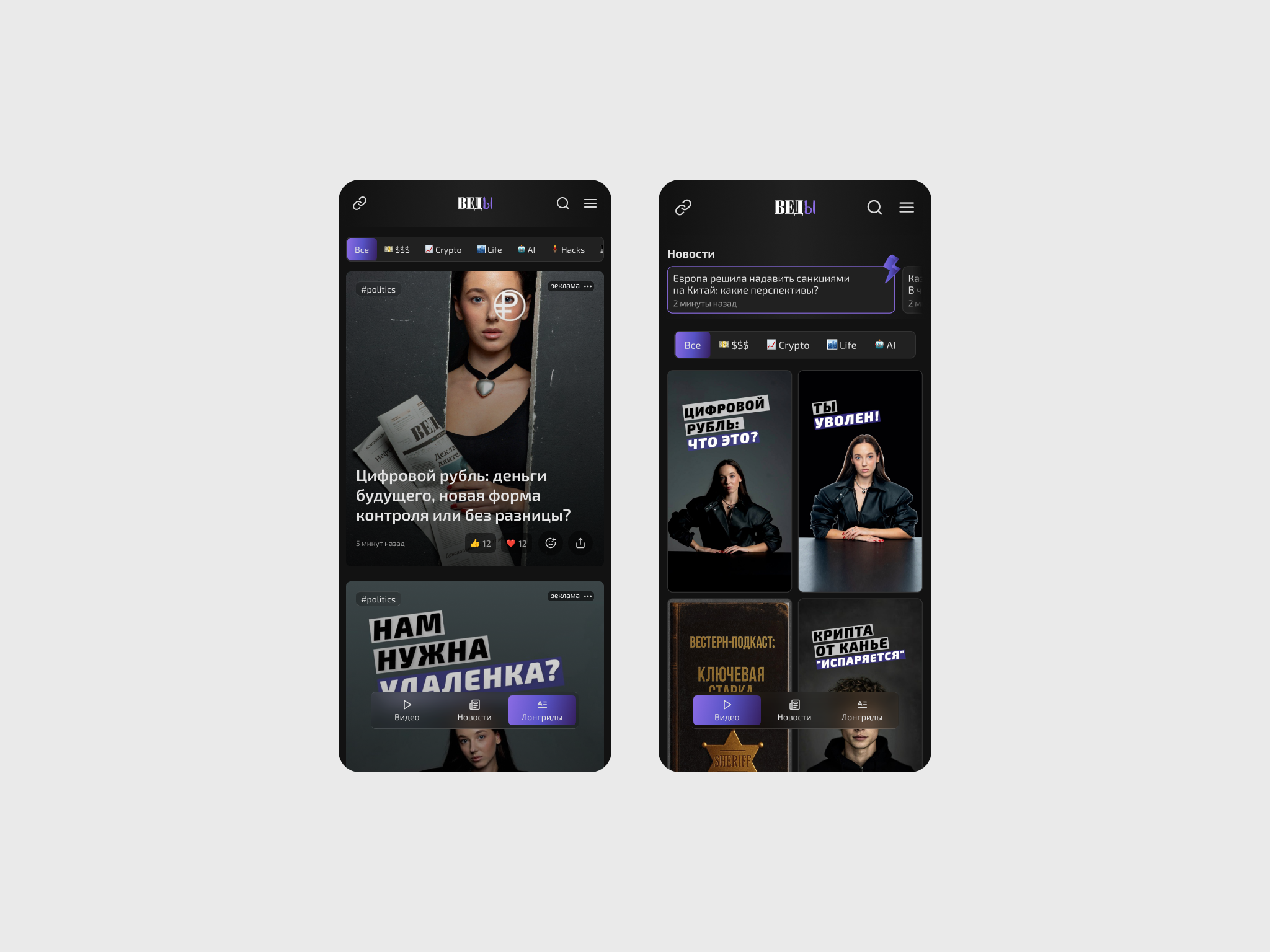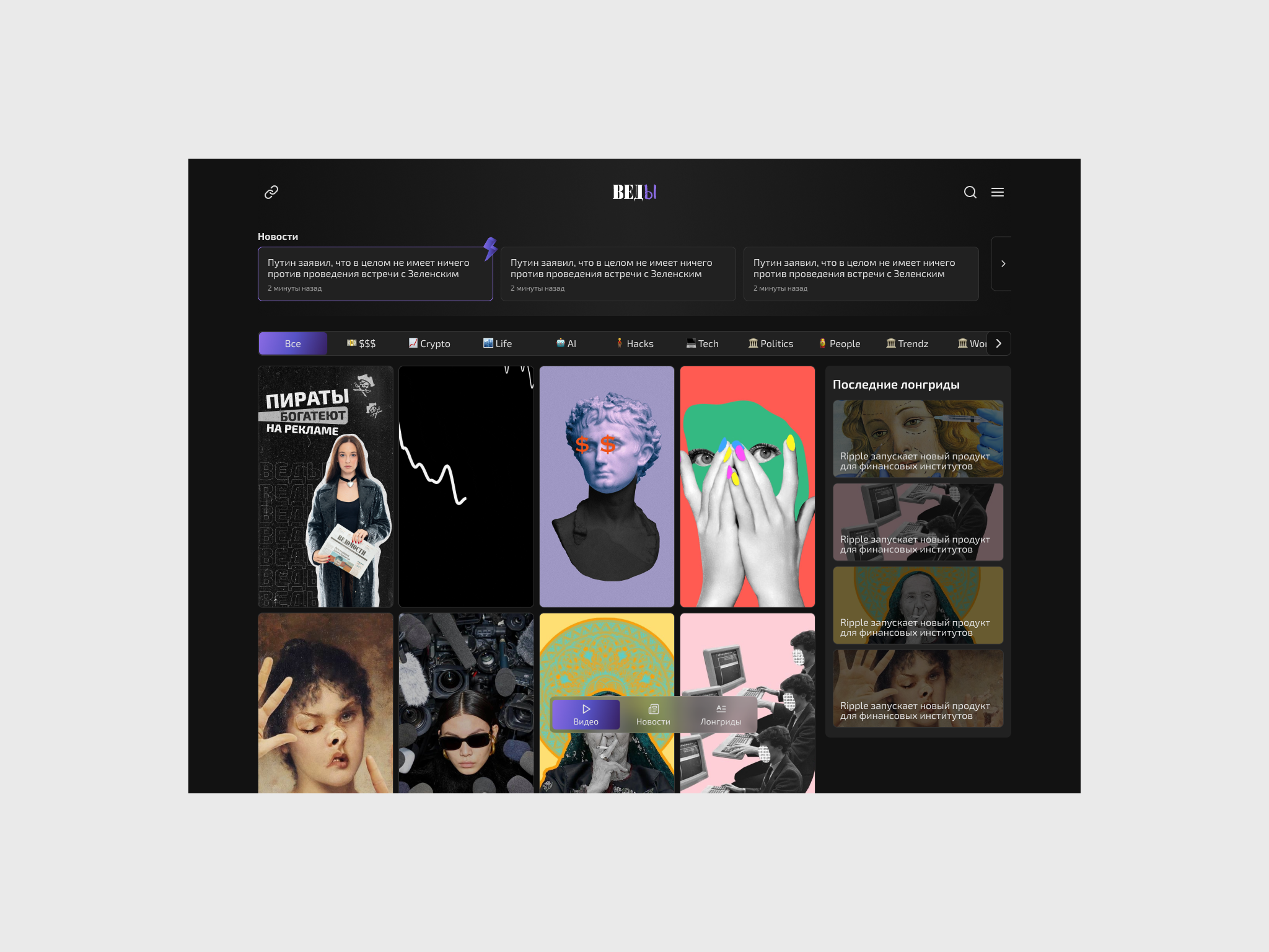 Создание цифрового медиа нового формата — суббренда «Ведомостей», ориентированного на поколение Z. Платформа объединяет вертикальные видео, лёгкие новости и современные лонгриды в одном интерфейсе с UX, привычным для пользователей TikTok и Instagram.